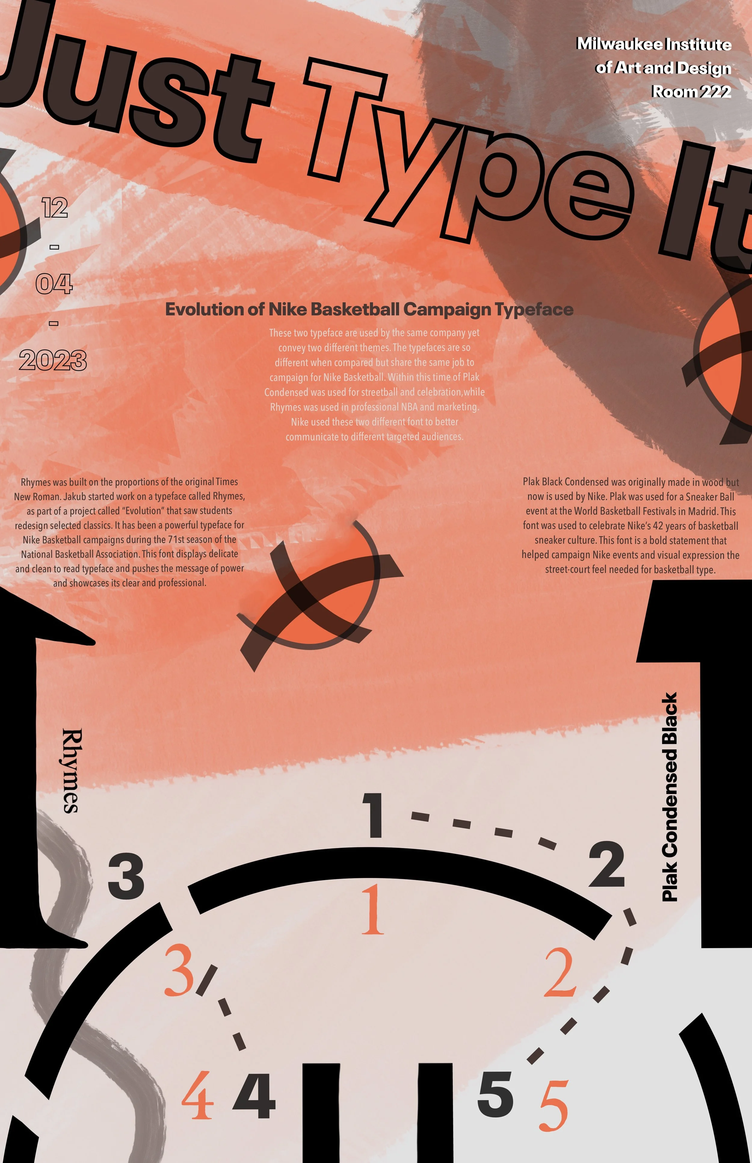 For this poster I took two different typefaces and compared them. I took Nike typefaces and created an evolution of Nike basketball campaign poster.